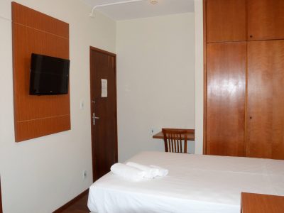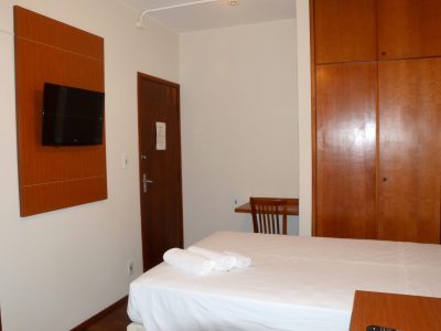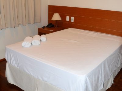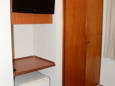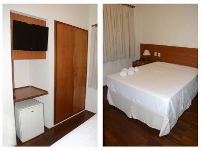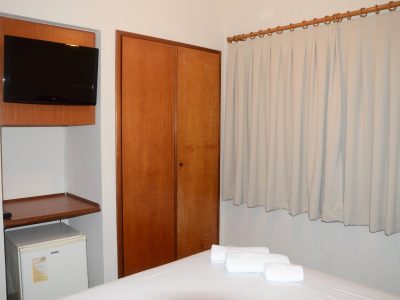 1 Cama box Casal 1,38×1,88m, Ar condicionado split, Ventilador de teto, Frigobar, Mesa de trabalho, Armário/Guarda-Roupas Embutido, Telefone, TV à cabo, Internet Wirelles e Cortinas Com Black-Out.