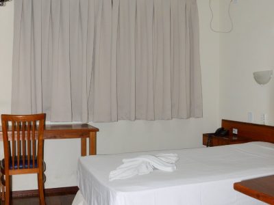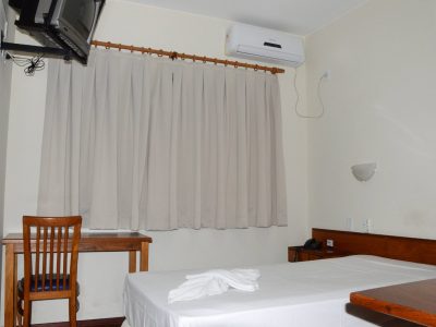 1 Cama box solteiro 0,96×2,03m, Ar condicionado split, Ventilador de teto, Frigobar, Mesa de trabalho, Armário/Guarda-Roupas Embutido, Telefone, TV à cabo, Internet Wirelles e Cortinas Com Black-Out
